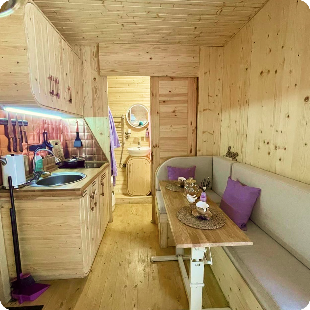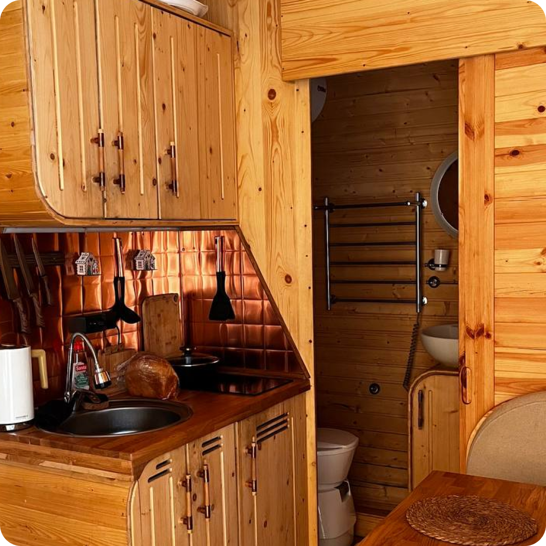 Отель оснащён кухней со встроенным холодильником, обеденной зоной и био санузлом, душевой и раковиной